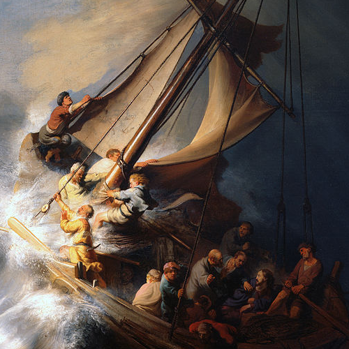 Diskusia: 1. Mal si už aj ty niekedy pocit, že Ježiš spí a nezaujíma sa o to, čo sa deje v tvojom živote? 2. Vinil si ho za nepríjemné veci, ktoré sa ti stali, alebo za jeho zdanlivú nečinnosť? 3. Keď si spomenieš na náročné situácie a udalosti vo svojom živote, povedal by si, že si sa z nich niečo naučil, pomohli ti zvládnuť veci, s ktorými si sa neskôr stretol? 4. Pozrime sa na Rembrandtov obraz Búrka na Galilejskom mori. Nechaj všetkým dostatok času, aby si obraz starostlivo poprezerali. a) Koľko osôb ste na lodi narátali? 14. Nie je ich dokonale vidno, ale je ich naozaj 14 b) Učeníkov na lodi by sme mohli rozdeliť do dvoch skupín: tých, ktorí sú naľavo od stožiara a tých, ktorí sú na pravej strane lode. Čo robia učeníci na ľavo od stožiara? Zo všetkých síl sa snažia zachrániť loď. Čo robia tí napravo? Prišli k Ježišovi, aby ho zobudili a prosili, aby ich zachránil. c) Hovorí sa, že postava v strede obrazu, ktorá sa díva priamo na nás, je sám maliar. Predstav si, že tou štrnástou postavou na lodi si ty. Ako by si sa zachoval na palube potápajúcej sa loďky? d) Keď sa tvoj život ocitne v búrke, ako sa správaš? Snažíš sa vyriešiť všetko z vlastných síl, ako učeníci na ľavej strane lode, alebo bežíš za Ježišom, aby ťa zachránil? Veríš, že Ježiš ti pomôže a nenechá ťa utopiť sa?