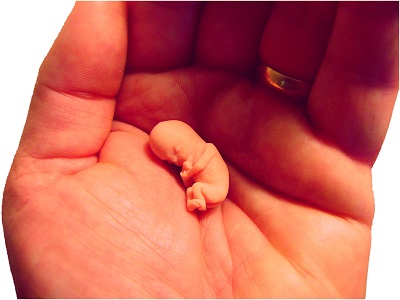 Aby to však neboli len suché informácie, na stôl vyloží (alebo z PPT premietne) obrázky nenarodeného dieťaťa (v prílohe). Zámerne sú vybraté dva konkrétne týždne v I. trimestri, preto zdôrazní dôležité informácie o nich: Už v 6. týždni od počatia na obrázku jednoznačne vidíme človiečika, nie nejaký zhluk buniek, červíčka a podobne. Pritom ide o čas, kedy ešte veľká časť žien ani nevie, že sú vôbec tehotné! Z tých 40-tich týždňov je to skutočne len malý zlomok času. Zopakuje, že už v tomto čase sa dieťa hýbe, bije mu srdiečko a pumpuje jeho vlastnú krv (teda nie maminu, ale  vlastnej krvnej skupiny), dajú sa rozoznať jednotlivé časti tela a podobne. Druhý obrázok (resp. séria obrázkov) je z 10. týždňa od počatia (ujasní, že oficiálne sa označuje ako 12. týždeň tehotenstva, keďže lekári tehotenstvo počítajú približne + dva týždne – od poslednej menštruácie). Je to čas, kedy je ešte na Slovensku možné ukončiť život dieťaťa bez akéhokoľvek vážneho dôvodu – proste stačí, aby o to žena požiadala a podľa našich zákonov jej to musí byť umožnené. Pritom je to už dieťa, ktoré má všetky orgány (aj keď nie všetky úplne funkčné), dokáže reagovať na emócie mamy, už má svoj jedinečný výraz tváre (takže napr. dvojičky v maternici by sa už dali od seba rozoznať), dokonca má veľa z ľudského správania, ktoré by sme ani nečakali – dokáže sa mračiť, hrať sa s pupočnou šnúrou, čká sa mu a podobne.