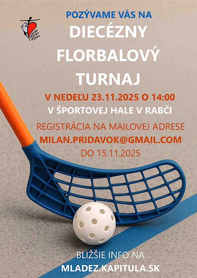 2. Centrum pastorácie mládeže v spolupráci s farnosťou Rabča vás pozýva na florbalový turnaj, ktorý sa uskutoční v rámci Týždňa Cirkvi pre mládež v nedeľu 23. novembra 2025 v Športovej hale v Rabči.