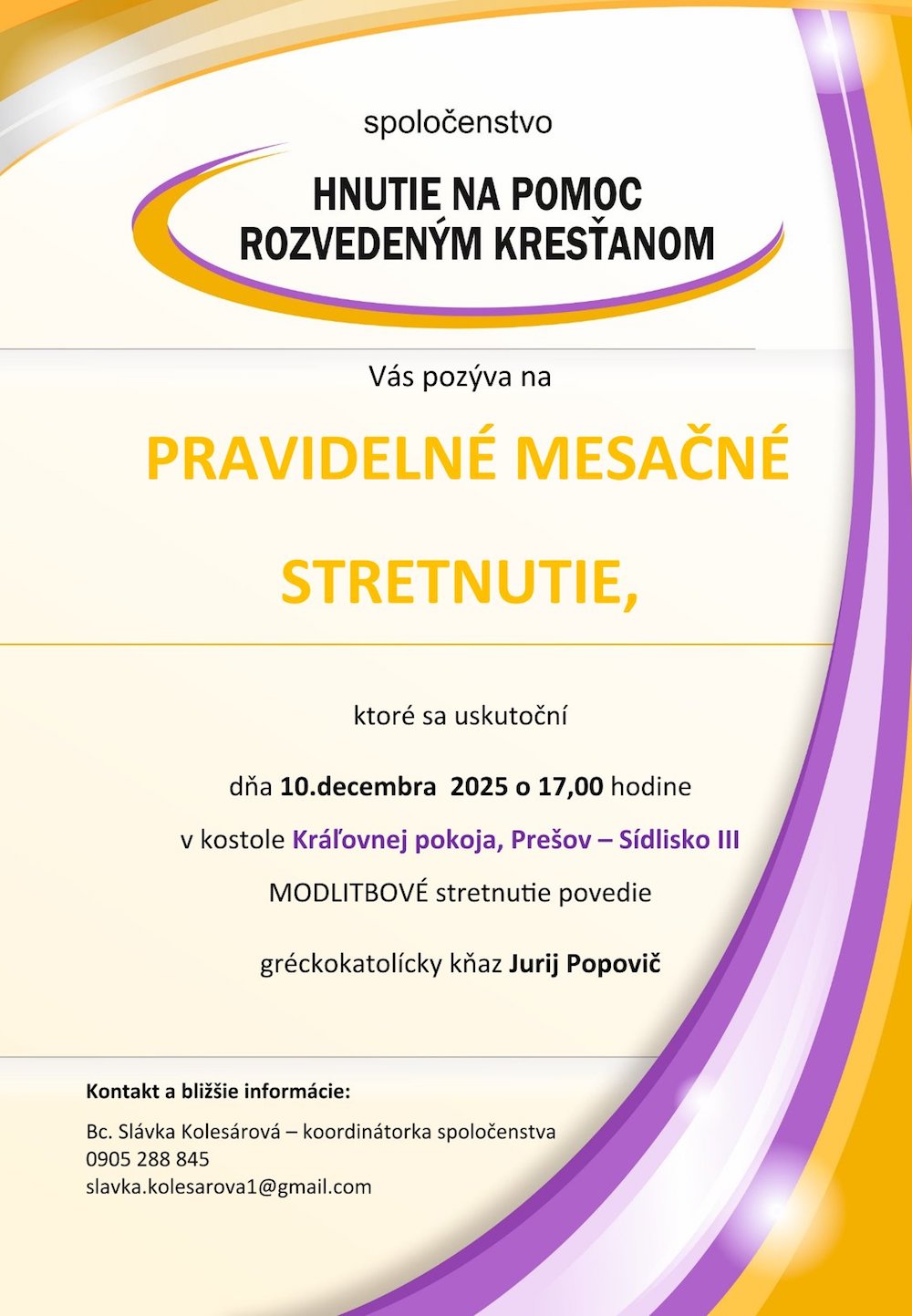 Spoločenstvo Hnutie na pomoc rozvedeným kresťanom Vás pozýva na pravidelné mesačné stretnutie ,ktoré sa uskutoční dňa 10.decembra 2025 o 17:00 hodine v kostole Kráľovnej pokoja, Prešov – Sídlisko III