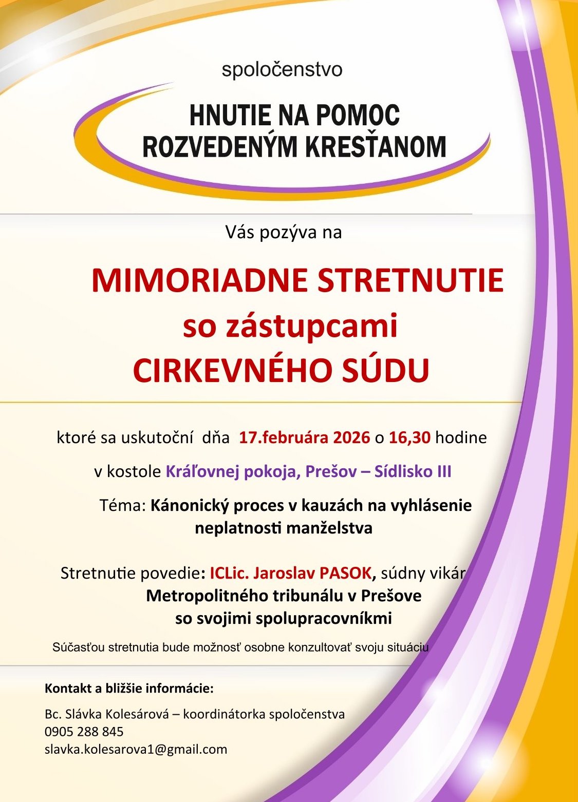 Spoločenstvo Hnutie na pomoc rozvedeným kresťanom Vás pozýva na pravidelné mesačné stretnutie ,ktoré sa uskutoční dňa 20.januára 2026 o 17:00 hodine v kostole Kráľovnej pokoja, Prešov – Sídlisko III