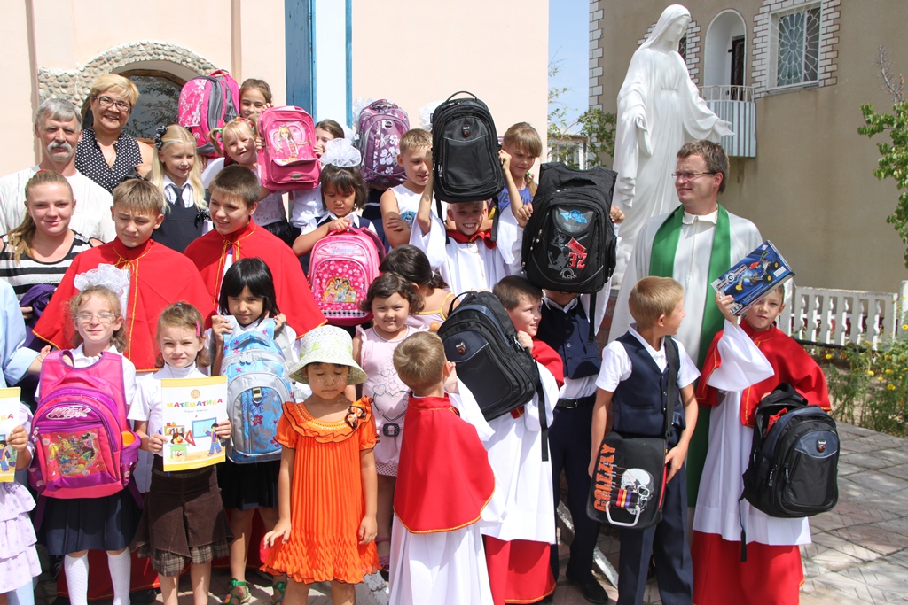 September sa pre nás tradične začal “Pjervim zvonkom” našich detí, ktoré sme spoločne sprevádzali v sobotu 1. septembra na otvorenie nového školského roku. Niektoré z nich išli do školy po prvý raz, niektoré naopak v tomto roku končia základnú školu. V ten istý deň naši starší študenti nastúpili na stredné školy v Almate. V nedeľu počas svätej omše sme sa zvlášť modlili za školákov, študentov, ich učiteľov a vychovávateľov a posvätili sme knihy a školské pomôcky vďaka ktorým v tomto roku budú nadobúdať nové vedomosti.