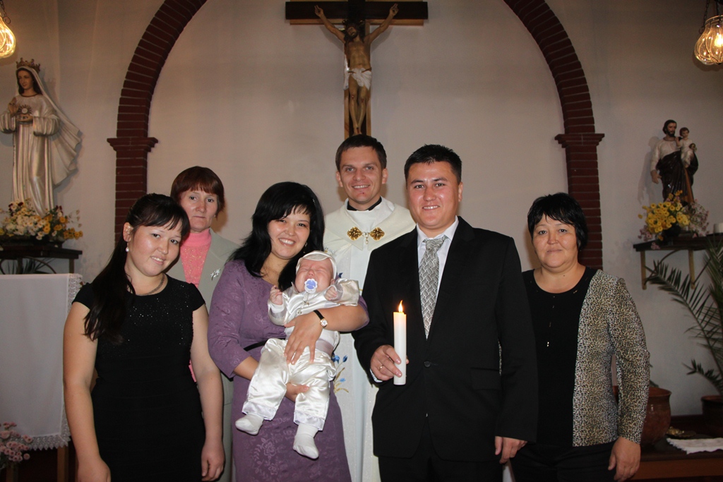 V polovici mesiaca si v našej farnosti vyslúžili sviatosť manželstva Erlan a Nadira. Hneď po sobášnom obrade sme pokrstili aj ich syna Arsena Joanna. Obaja mladí ľudia v detstve a mladosti žili v Domoch Panny Márie ešte pod vedením otca Massima a boli ním a jeho spolupracovníkmi vychovaní a pripravení do života. V súčastnosti je z Erlana dobrý architekt, ktorý zároveň vedie menšiu stavebnú firmu, spoločne s manželkou prerábajú vlastný byt, vychovávajú syna, pravidelne pristupujú k sviatostiam a navštevujú našu farnosť. V tomto roku to bol už tretí sobáš v našej farnosti.