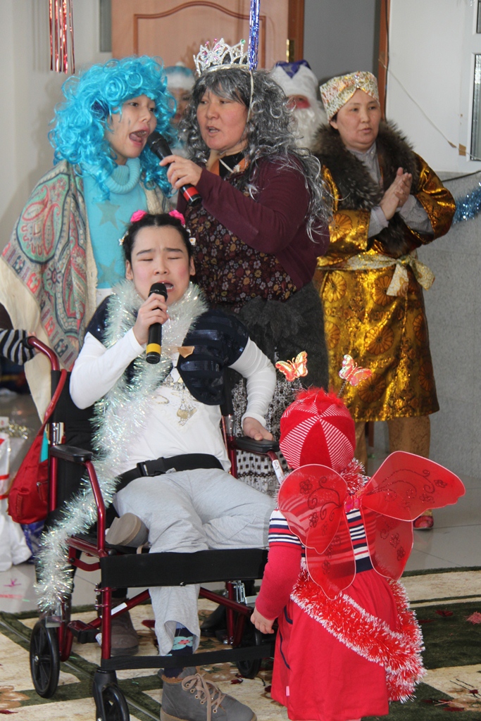 Pretože naším deťom Novoročné sviatky zabezpečili naši darcovia, usilovali sme sa aj my pomôcť iným. Preto sme darčekmi a pohostením pomohli spolu s našimi priateľmi z protestantskej cirkvi pri organizácii „Novoročnej jedličky“ pre 60 telesne a duševne postihnutých detí v Kapčagaji.