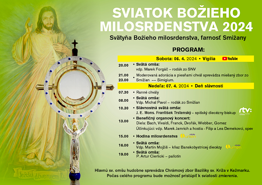 Duchovný program na sviatok Božieho milosrdenstva, ktorý sa bude konať v dňoch 6. - 7. 4. 2024 vo Svätyni Božieho milosrdenstva v Smižanoch.