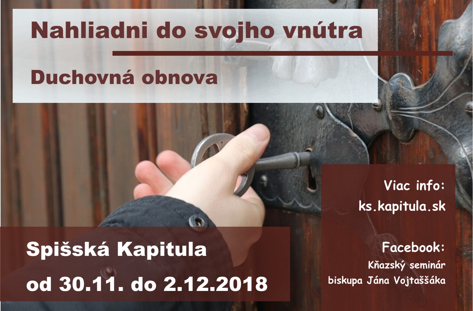 Načo duchovná obnova? Niekedy potrebuje človek vojsť do TICHA - a na nejaký čas odísť z kolotoča tohto sveta. Zamyslieť sa nad svojím vzťahom s Bohom, nad svojim životom, správaním, hodnotami, nad otázkami, ktoré má vo svojom vnútri... (A čas strávený v pokojnom prostredí Spišskej Kapituly ti v tom môže určite pomôcť.) O to viac, že je čas adventu a môžeš sa viac pripraviť na Vianoce.