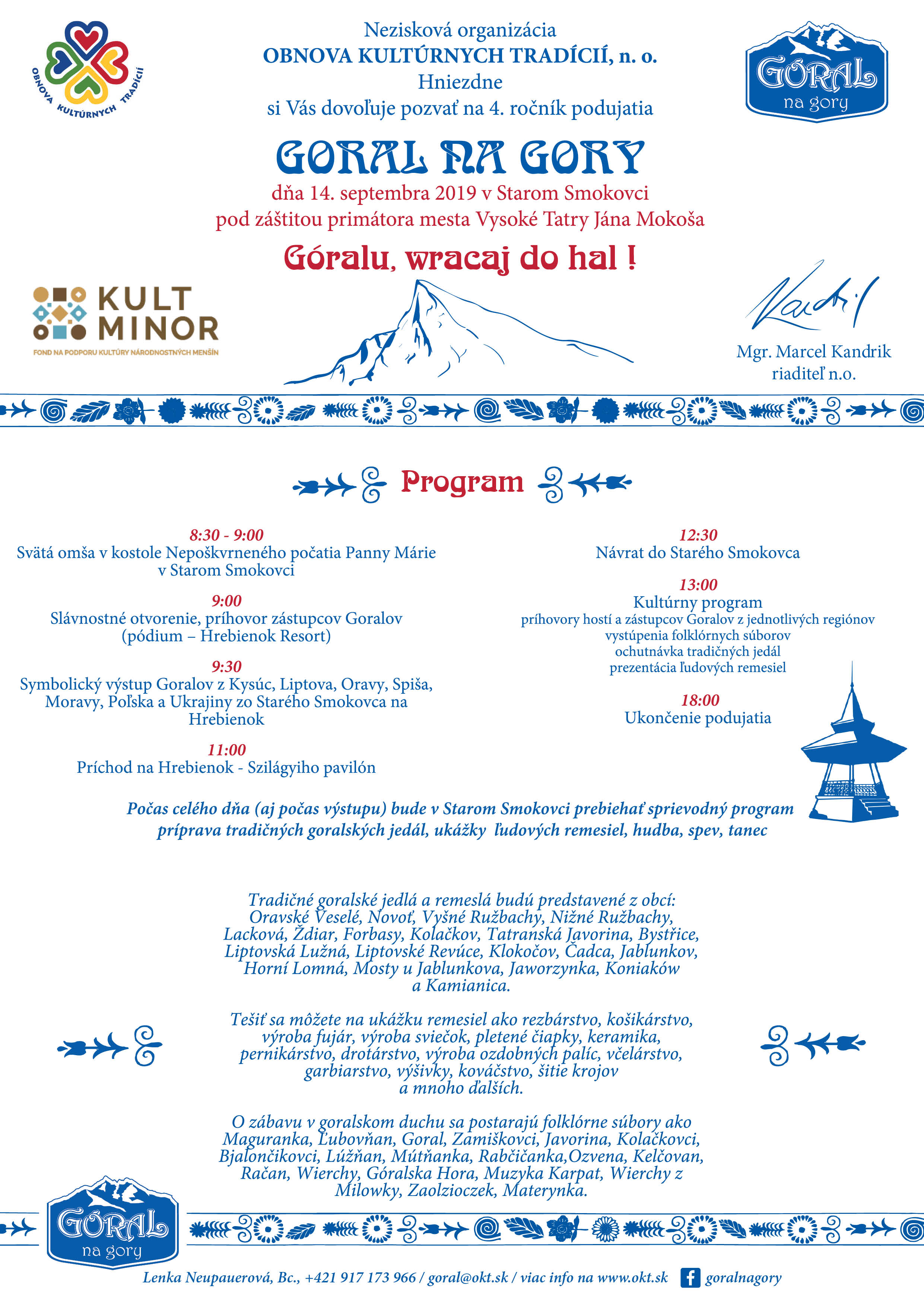 Celodenné medzinárodné stretnutie Goralov už štvrtý rok spája nielen Goralov zo všetkých goralských regiónov Slovenska, Českej republiky, Poľska a Ukrajiny, ale aj priaznivcov goralskej kultúry, tradícií, návštevníkov Tatier a milovníkov turistiky. Hlavným bodom programu je už tradičný symbolický výstup Goralov zo Starého Smokovca na Hrebienok.
