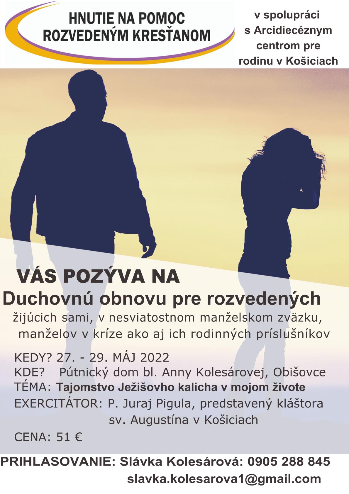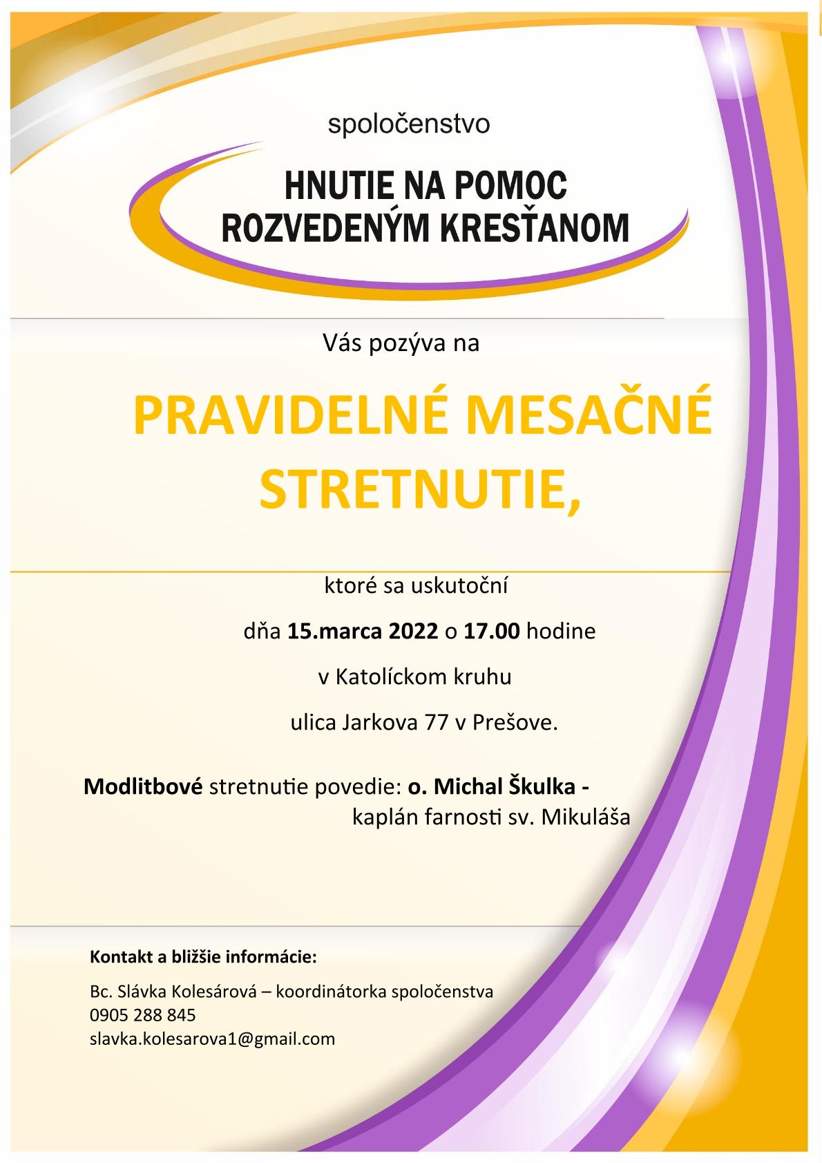 Spoločenstvo Hnutie na pomoc rozvedeným kresťanom Vás pozýva na pravidelné mesačné stretnutie, ktoré sa uskutoční dňa 15. marca 2022 o 17:00 hodine v Katolíckom kruhu, ulica Jarkova 77 v Prešove. Stretnutiu povedie: o. Michal Škulka – kaplán farnosti sv. Mikuláša v Prešove