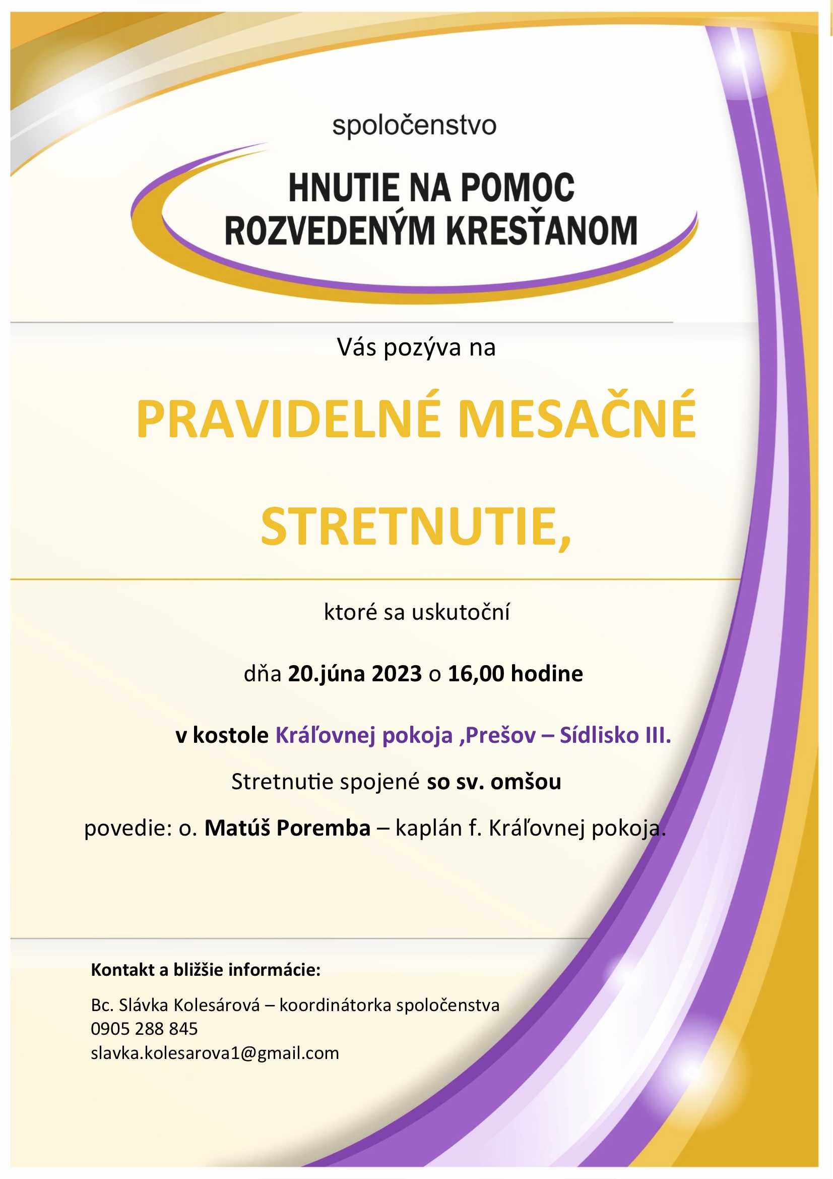 Spoločenstvo Hnutie na pomoc rozvedeným kresťanom Vás pozýva na pravidelné mesačné stretnutie , ktoré sa uskutoční dňa 20.júna 2023 o 16.00 hodine.