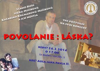 Priatelia (aj Vaši priatelia a priatelia Vašich priateľov) - srdečne Vás pozývam, spolu so svojimi speváčkami a s hosťami, na náš koncert, opäť po rokoch..., ale s rovnakou túžbou byť Božím nástrojom, v tomto prípade hudobným... Koncert sa uskutoční 26.2.2014 o 17.h v Aule Jána Pavla II. na Katolíckej univerzite v Ružomberku. Všetci ste pozvaní, miesta je dosť. Zatiaľ. :-)