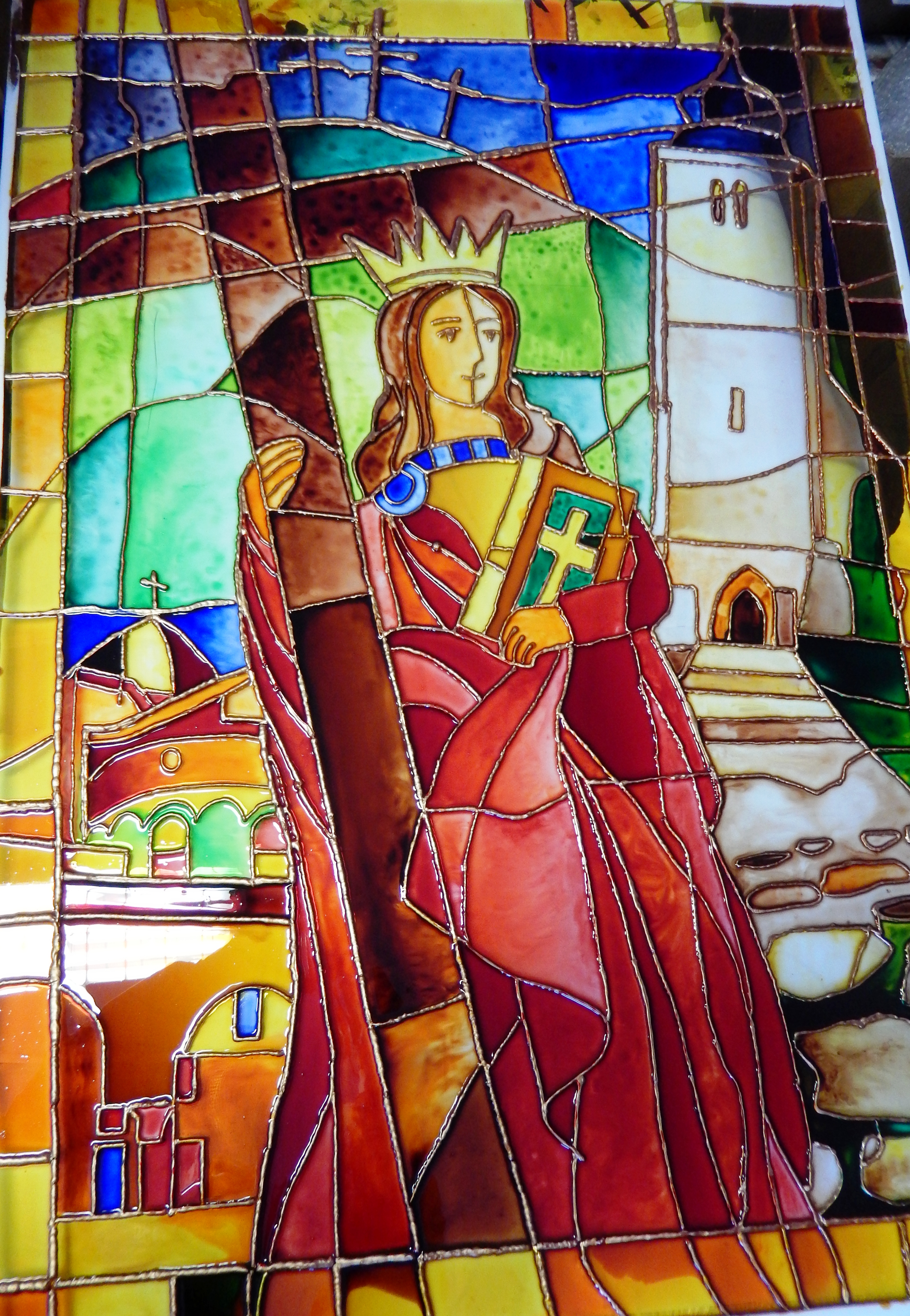 Sv. Helena po svojom obrátení ku kresťanstva dala preskúmať miesta, kde bol ukrižovaný Pán Ježiš. Vtedy našli sv. kríž a preto obraz zachycuje sv. Helenu, s kráľovskou korunou, ako ho drží v ruke. Od tých čias sa v Cirkvi slávi sviatok Povýšenia sv. Kríža, ktorý je aj odpustovou slávnosťou v našom centre. Sv. Helena sa zaslúžila o zachovanie pamätných miest kresťanstva v Jeruzaleme, čo vyjadruje v ľavej časti Bazilika sv. Hrobu, ktorú dal vybudovať jej syn cisár Konštantín. Sv. Helena je aj patrónkou našej obce Krížovej Vsi, a preto v pravej časti obrazu je zachytený náš kostol.
