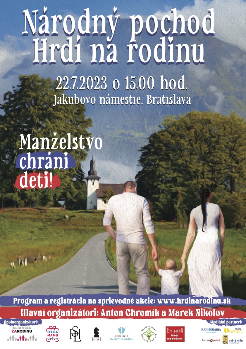 v sobotu 22. júla 2023 o 15:00 hod. sa v Bratislave na Jakubovom námestí uskutoční celonárodný pochod Hrdí na rodinu. Ide už o 11. ročník pochodu ľudí v červených tričkách, ktorí chcú verejne a radostne ukázať, že rodina je úžasná a výnimočná, lebo deti sú naša budúcnosť.