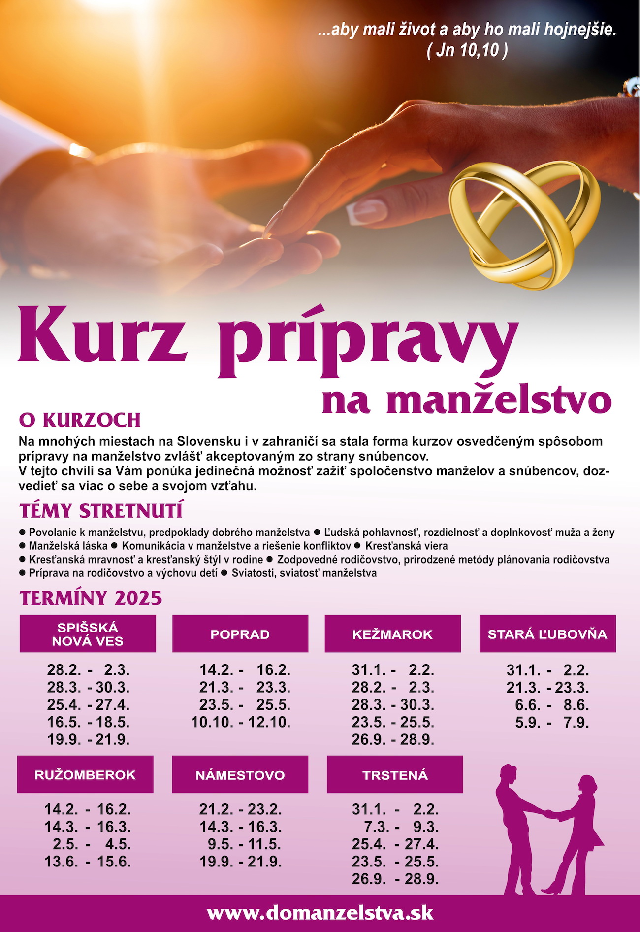 Termíny kurzov v rámci Slovenska a možnosť prihlásenia sa, sa nachádzajú aj na stránke www.domanzelstva.sk